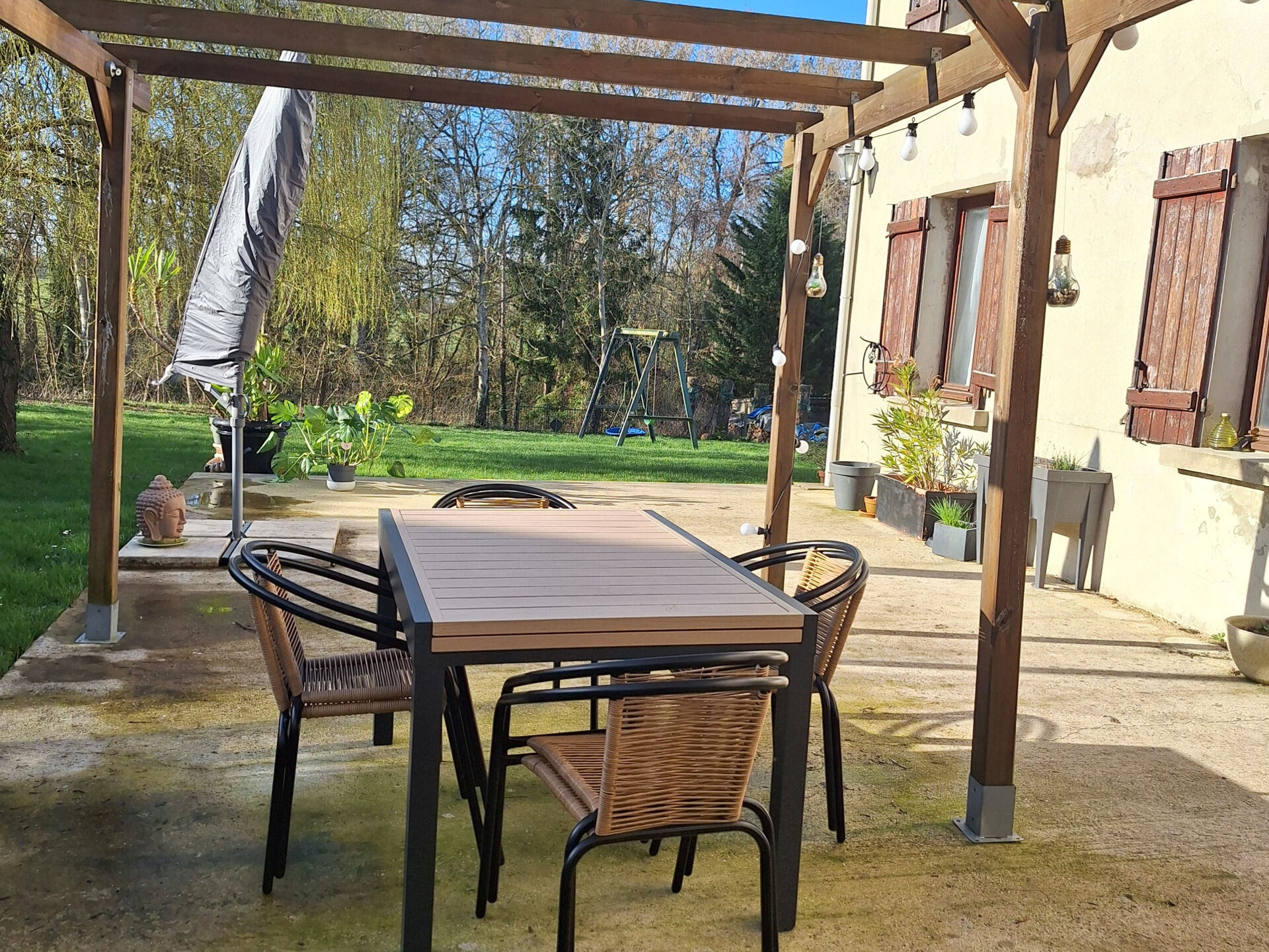 Extérieur : Préau pour stationnement ou rangement (véhicule, vélos, tondeuse...), Une terrasse - Cuisine d'été à rafraichir. Terrain d'environ 480 m2